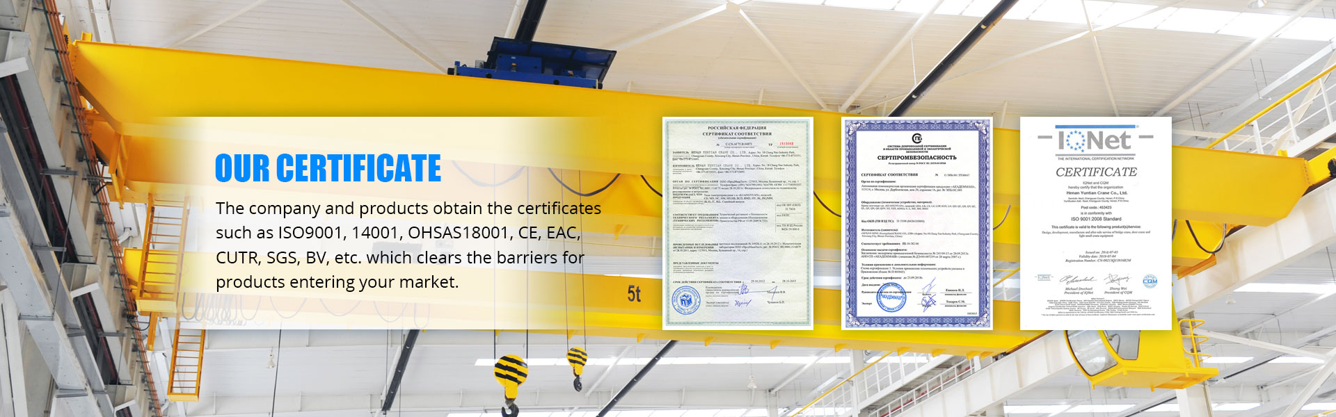 ما می توانیم شما را به انواع جرثقیل های صنعتی از 0.25tons به 900tons، GB / T 19001-2000 IDT عبور ISO 9001: 2000، GB / T 24001-2004 IDT ISO 14001: 2004، GB / T 28001-2001، OHSAS 18001: 1999، CE، GOST، SGS، TUV، BV و غیره.